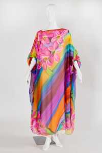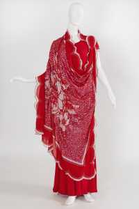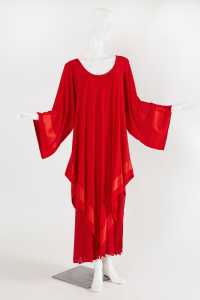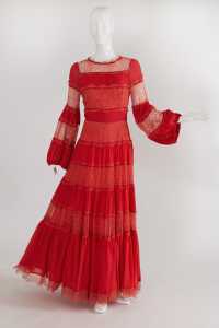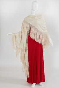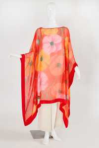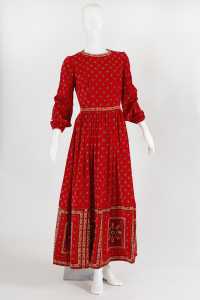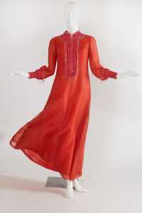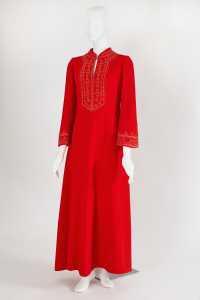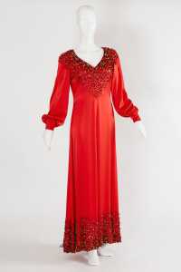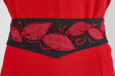 Robe princesse en petit satin de soie, brodée de perles en bois multicolores et de paillettes rouges, décolleté en V, manches chemisier fermées par 3 boutons en satin.