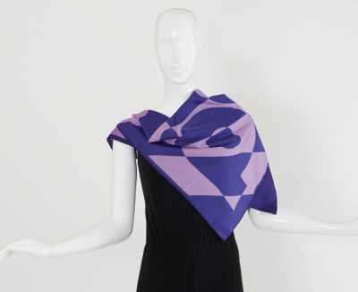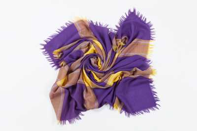 Etole en laine à décor quadrillé violet et jaune, 135 x 135 cm environ.