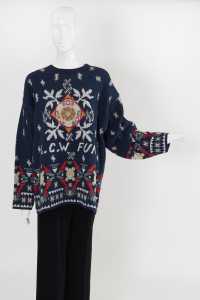 Pull en laine à motifs stylisé sur fond bleu marine.