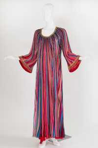 Robe longue évasée en mousseline rayée entièrement brodée de tubes, col rond, manches longues évasées.