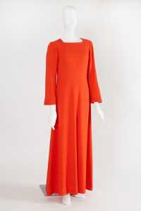 Robe longue évasée orange en crêpe, encolure carrée surpiquée, manches longues évasées.