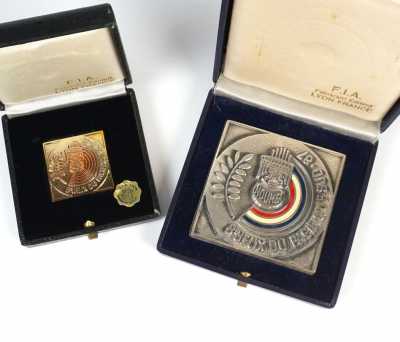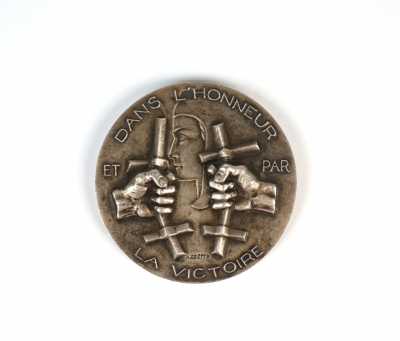 A/ "Dans l'honneur et par la victoire" Deux poings serrés écartant des bareaux laissant apparaitre le profil de La République coiffée du bonne...