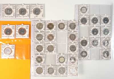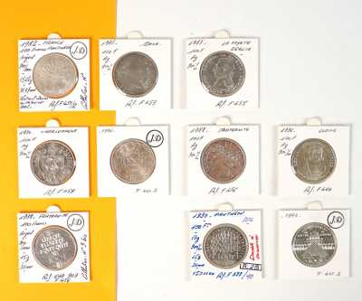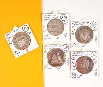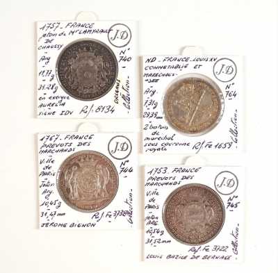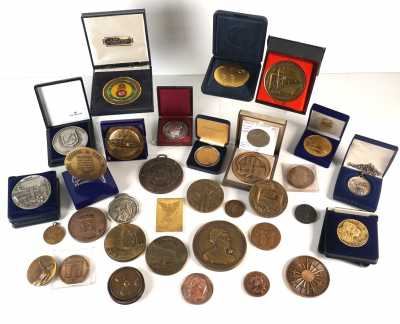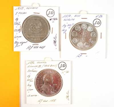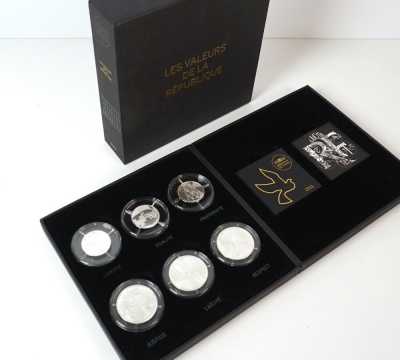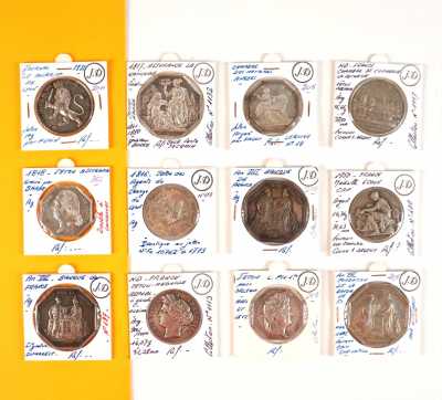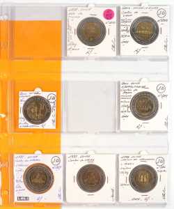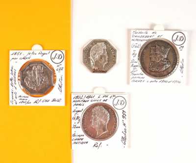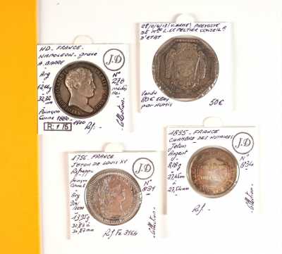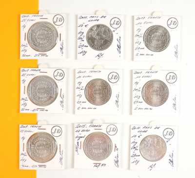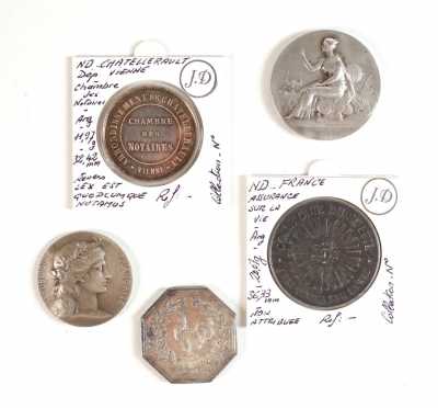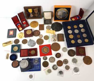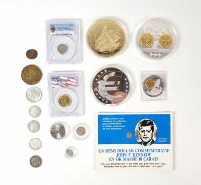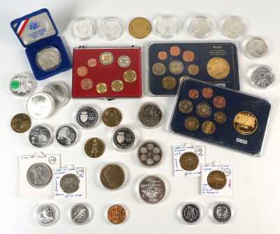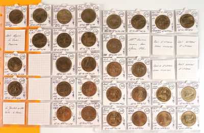 On joint un lot d'écus et euros commémoratifs, jetons Monnaie de Paris, médailles europa et divers, 32 exemplaires, dont essai "Fin du concours régional du franc 2001" d'...