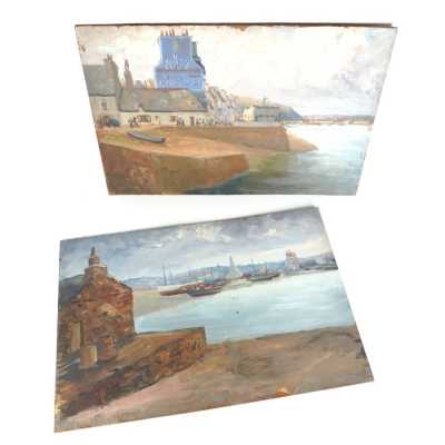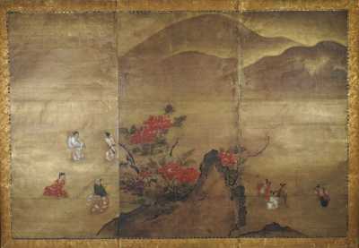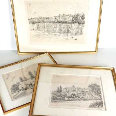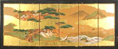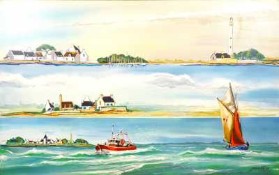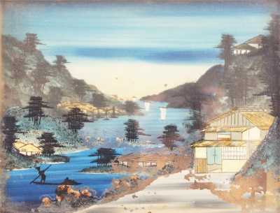 Trois estampes de format oban tate-e formant triptyque de Toyohara Kunichika "Vue de la baie d'Akashi" 33.5 x 70 cm (à vue).