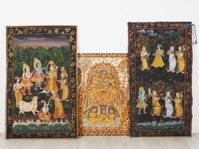 On joint un autre panneau représentant figurant une scène de divinités, Bali, 20ème siècle, 70 x 84 cm.