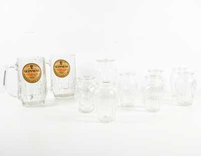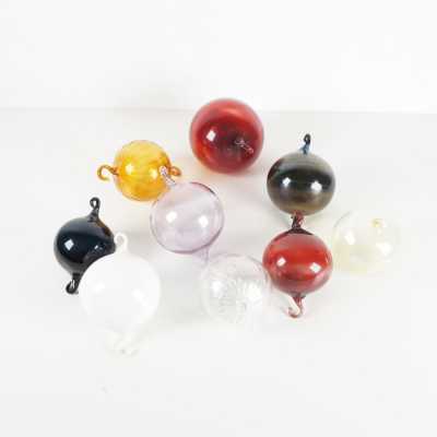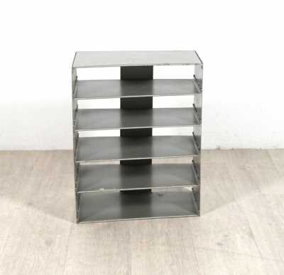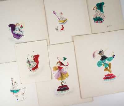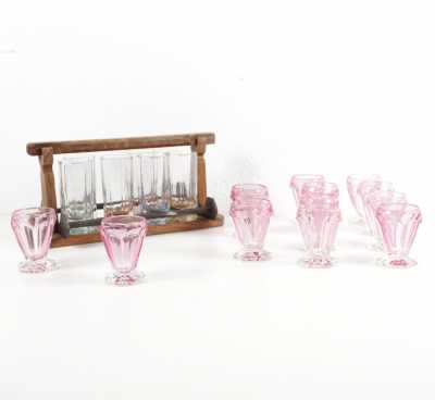On joint 6 verres à liqueur, chacun d'une couleur, dans un support en bois, H. Verre : 8.5 cm.