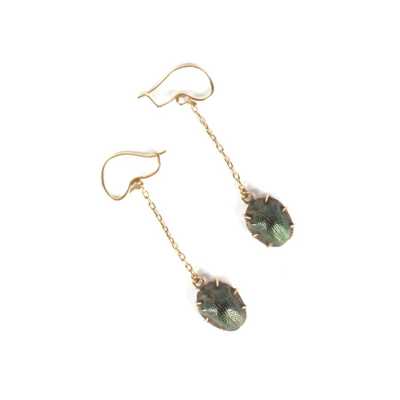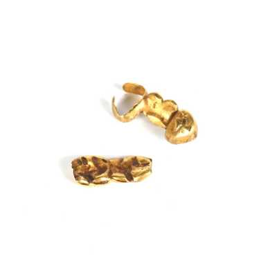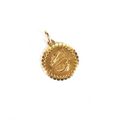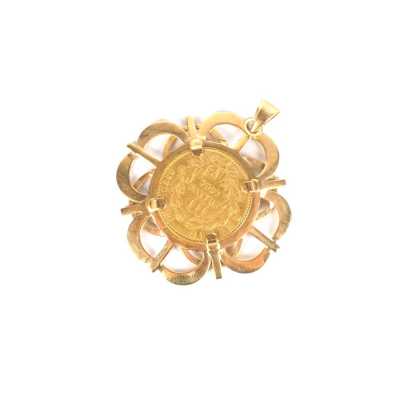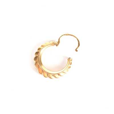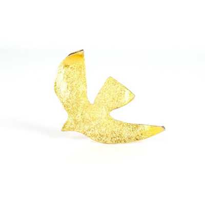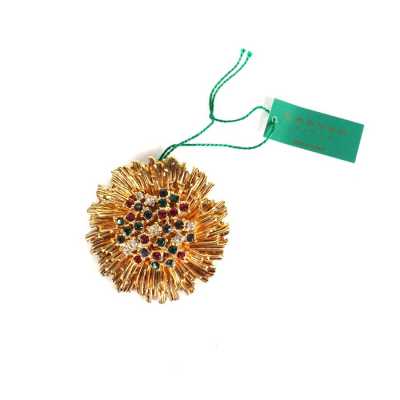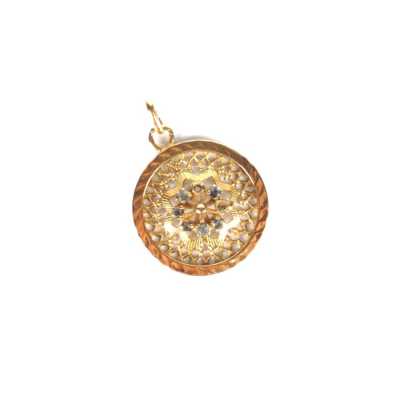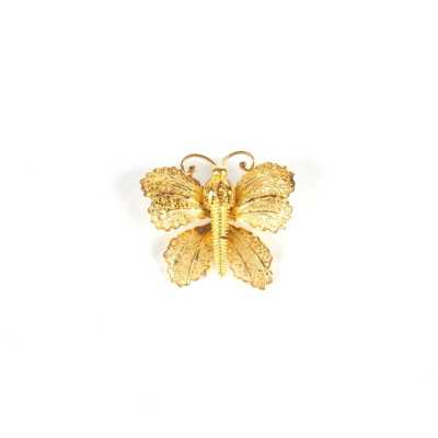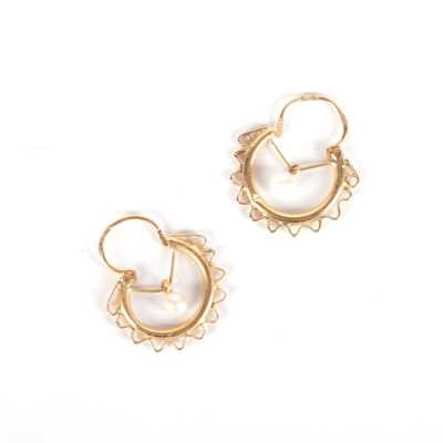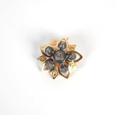 On joint deux broches en métal doré, l'une à motif d'un poisson (Dim. 7.2 x 5.2 cm) et l'autre à motif rayonnant (D. 4.4 cm).
