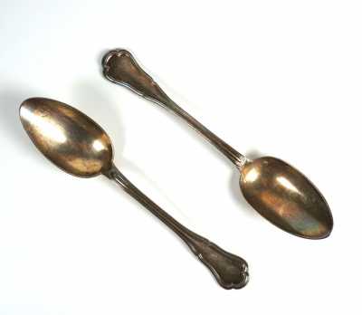 - 2 cuillères poinçon Minerve 1er titre, modèle uniplat, le manche monogrammé.