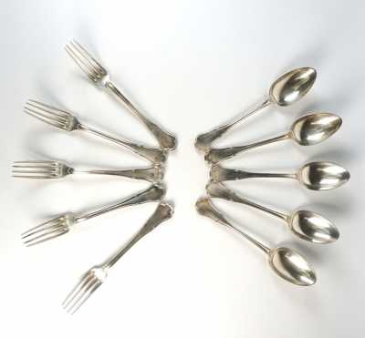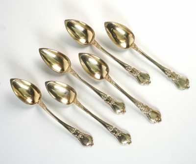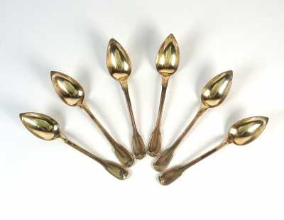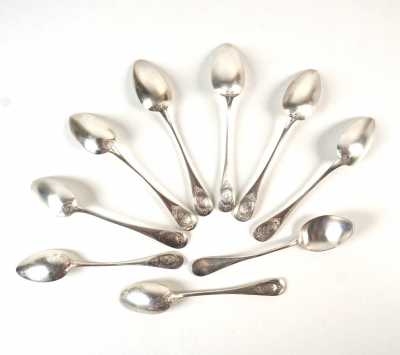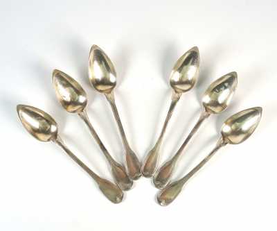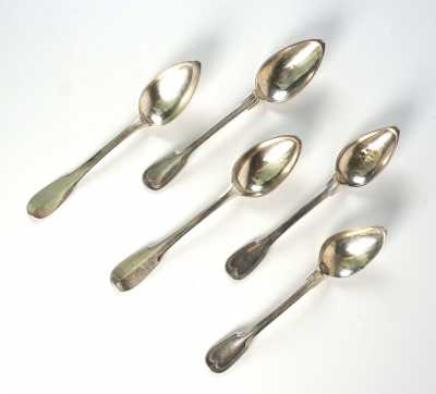 On joint 5 petites cuillères en argent, poinçon Minerve, d'un modèle coquille similaire, MO "SFC".