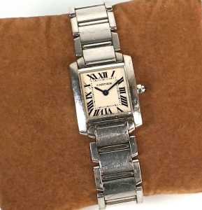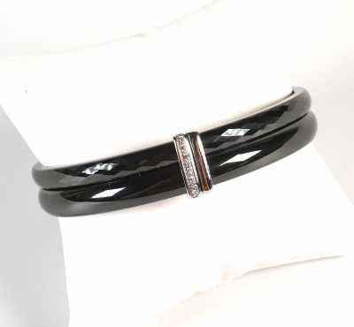 Présentée avec sa chaine maille forçat diamantée en or blanc 18 K (750/oo), L. 4...