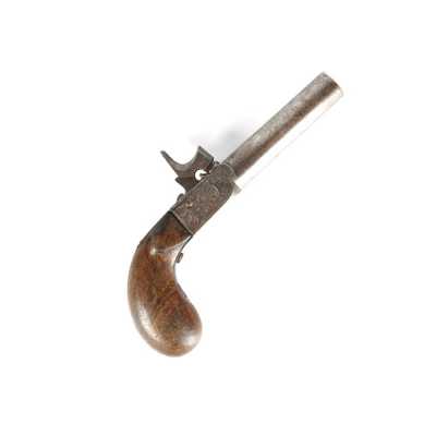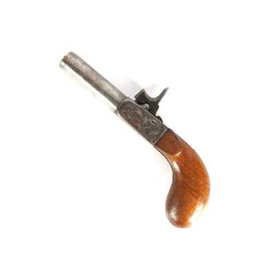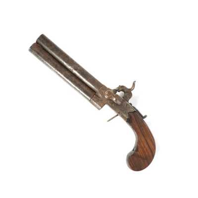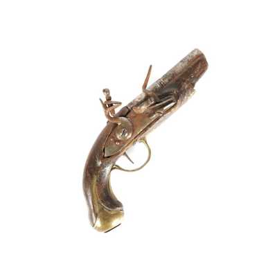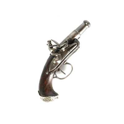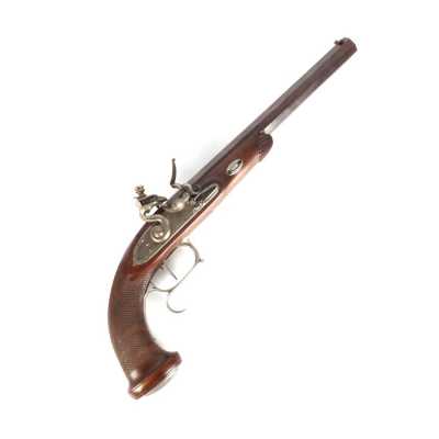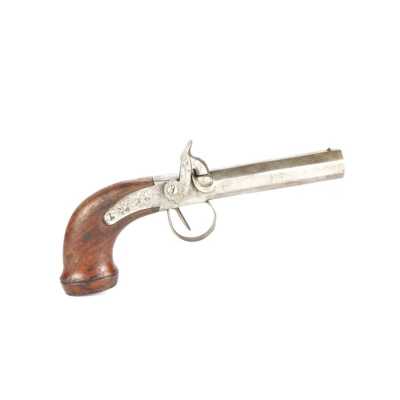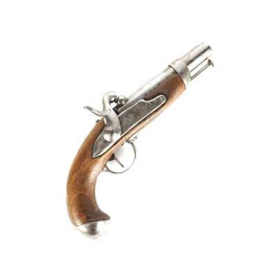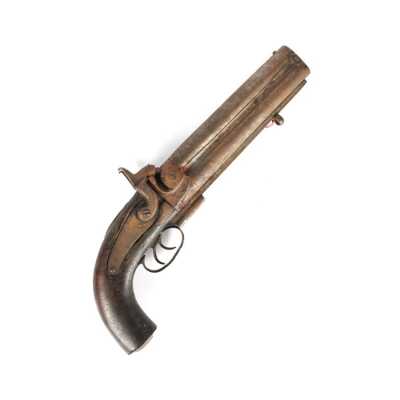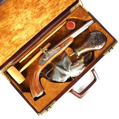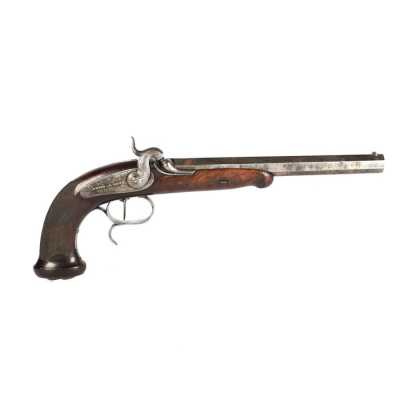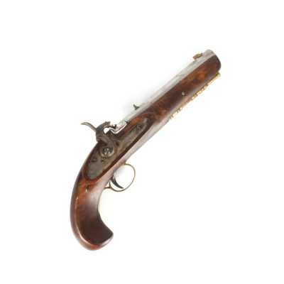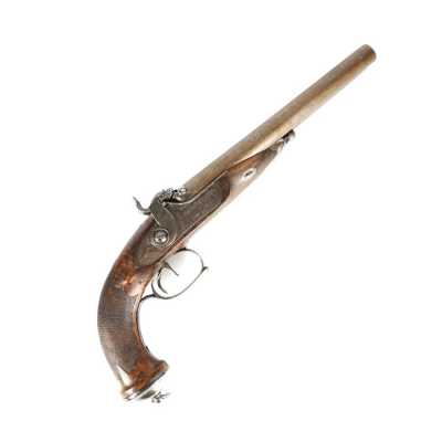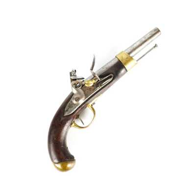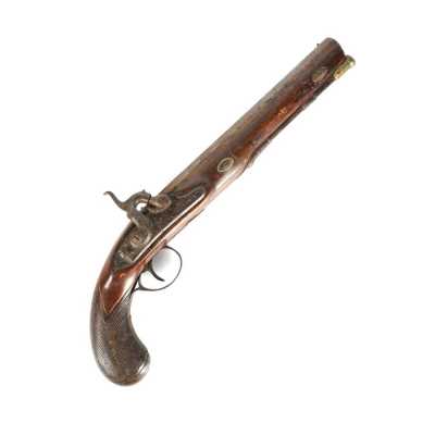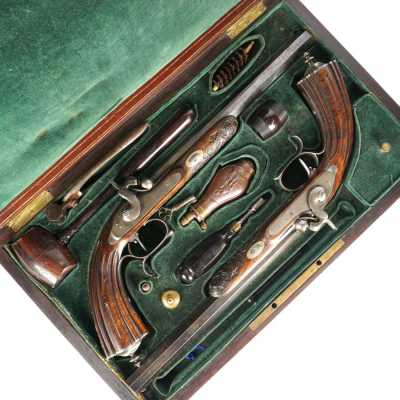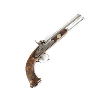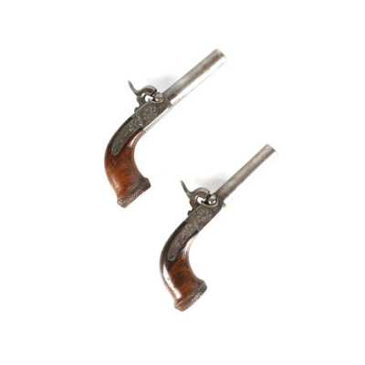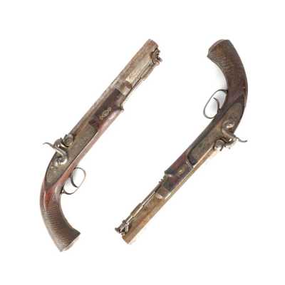 PAIRE DE PISTOLETS A PERCUSSION, platines à percussion, platines à corps plats et chiens à corps ronds, canons à pans marqués " DUSSAIGNE A SAINTES ", garnitures en fer, pon...
