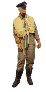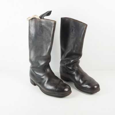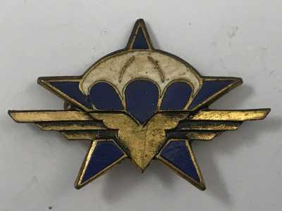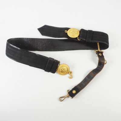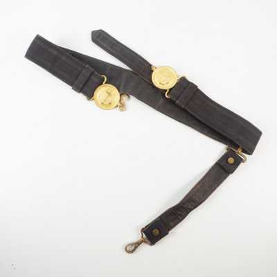 CASQUETTE, en drap bleu, insigne brodée en cannetille or et métal doré, bandeau noir en laine, fausse jugulaire en cuir noir verni, jugulaire cuir vernis, visière ...