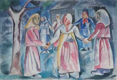 Natalia Sergueïevna GONTCHAROVA (1881-1962), "La ronde" circa 1910, dessin au fusain et l'aquarelle sur papier, monogrammé en bas à gauche en cyrillique, 39 x 57 cm (petites déchirures sur le pourtour, deux petits trous dans le papier et léger soulèv...