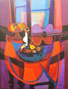 Marcel MOULY (1918-2008), "Fruits et guitare devant la fenêtre "88, huile sur toile signée et datée en bas à droite, contresignée, titrée et datée au dos, situé Gentilly, 118 x 89 cm.