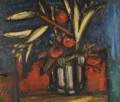 Franz PRIKING (1929-1979), "Nature morte au bouquet de lys" 57, huile sur toile signée et datée en bas à gauche, 38 x 46 cm (trois infimes écaillures).