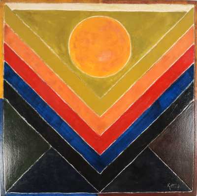 Sayed Haider RAZA (1922-2016), "Composition", panneau de plâtre émaillé, signé en creux en bas à droite, porte le cachet au dos, 56 x 56.5 cm.